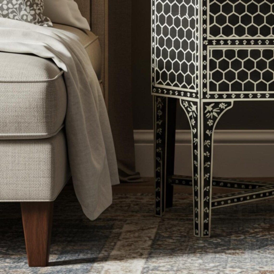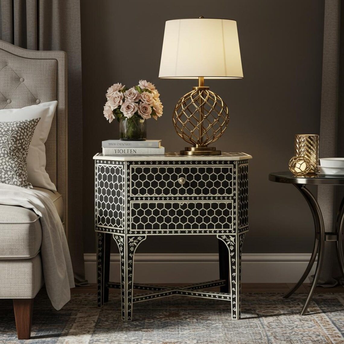 Add a touch of timeless luxury to your bedroom with this handmade black bone inlay nightstand, showcasing an elegant honeycomb geometric design. Each piece is meticulously crafted by skilled Indian artisans, ensuring heirloom quality and distinct character.