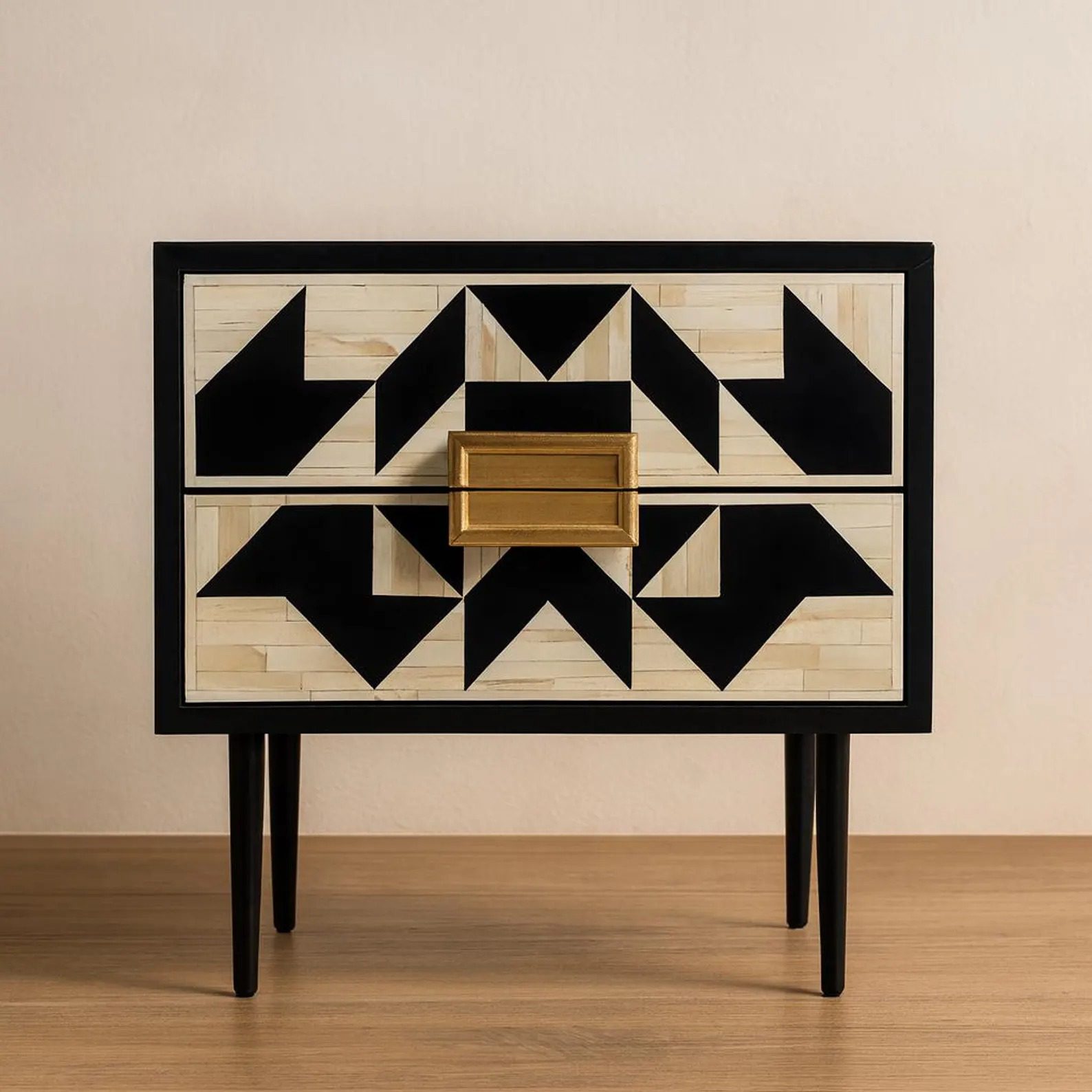 Enhance your bedroom with this handcrafted black and ivory bone inlay bedside table, a striking blend of artistry and utility. Featuring two smooth-gliding drawers with elegant brass handles, this nightstand provides both stylish storage and timeless design.