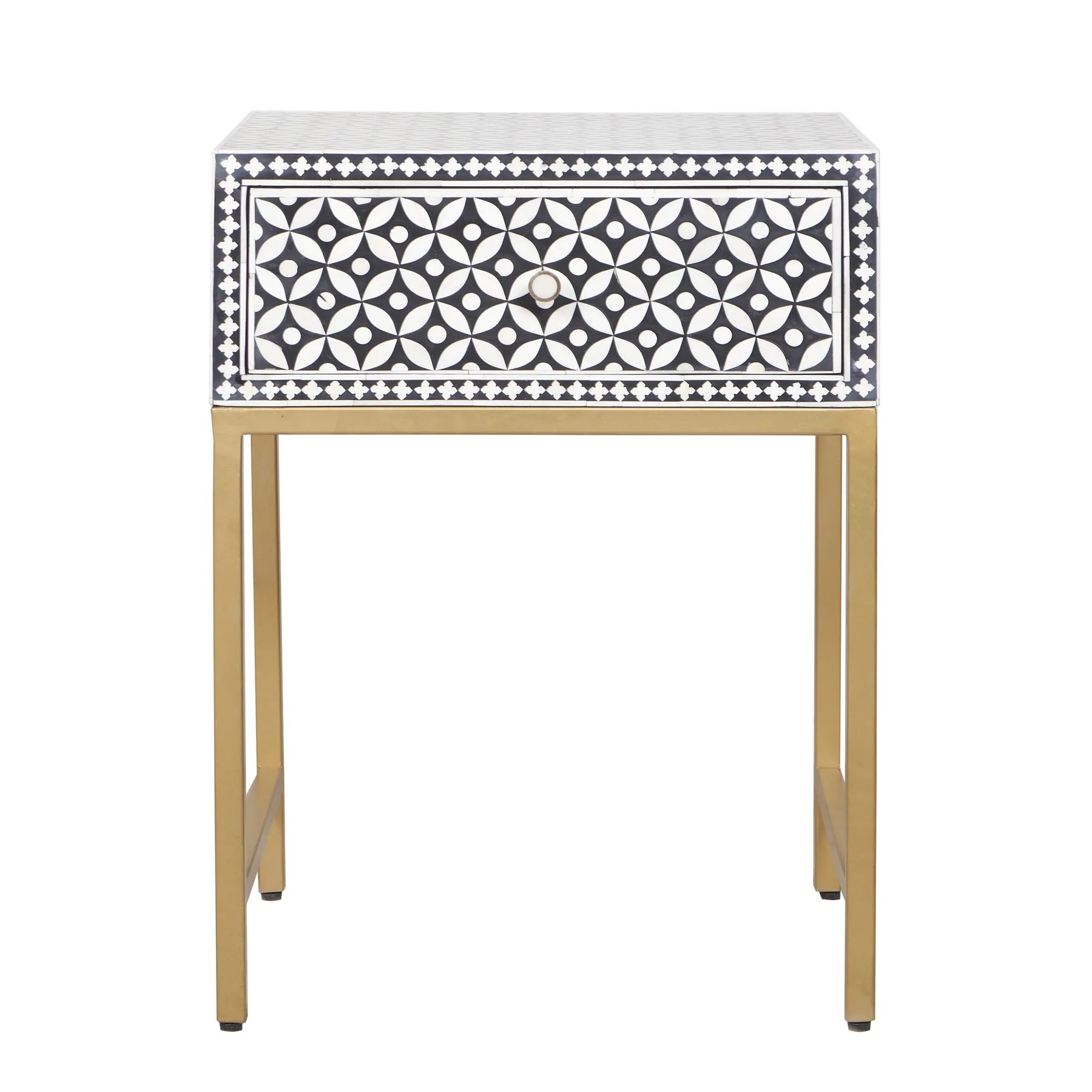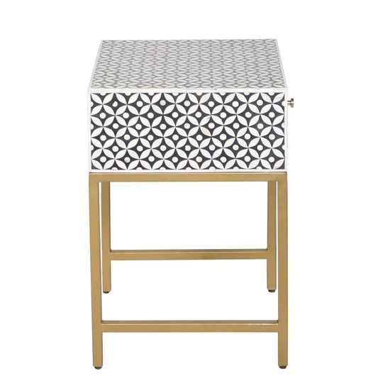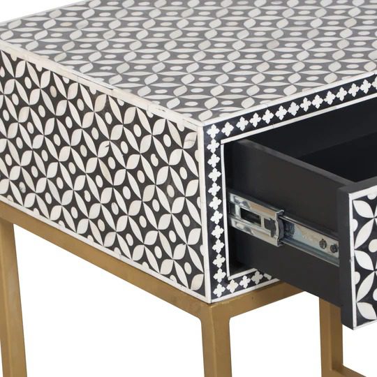 Each piece is made with ethically sourced camel bone, hand-cut and inlaid into a sophisticated geometric pattern, set against a striking black resin base. The contemporary design makes it versatile for both modern and classic interiors, while the single spacious drawer provides functional storage for daily essentials. The polished surface serves as the ideal spot for a bedside lamp, books, or decorative accents.