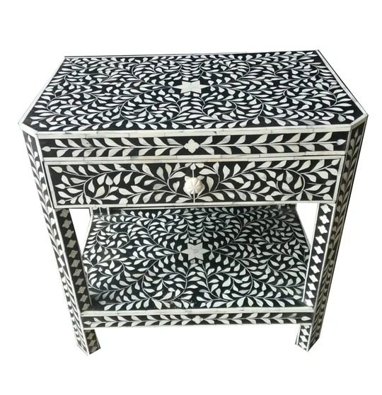 Each piece is meticulously handcrafted using sustainably sourced camel bone, inlaid by hand into a delicate floral motif, and set against a refined grey resin base. The soft neutral tones make it a versatile furniture piece, pairing beautifully with any bedroom or living room décor. A spacious drawer provides storage for essentials, while the flat tabletop serves as the perfect surface for a lamp, book, or decorative accents.