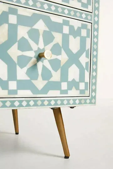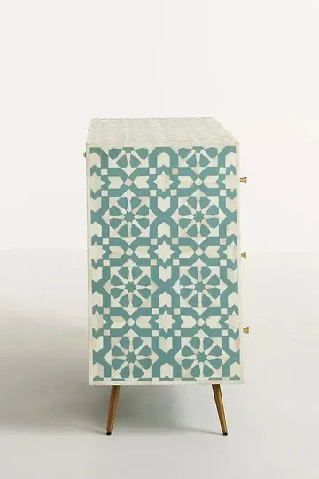This dresser is meticulously crafted with ethically sourced bone inlay, set into durable resin, and supported by a sturdy solid wood base. Each floral or geometric design is carefully hand-carved and arranged, ensuring every dresser is a unique piece of functional art.