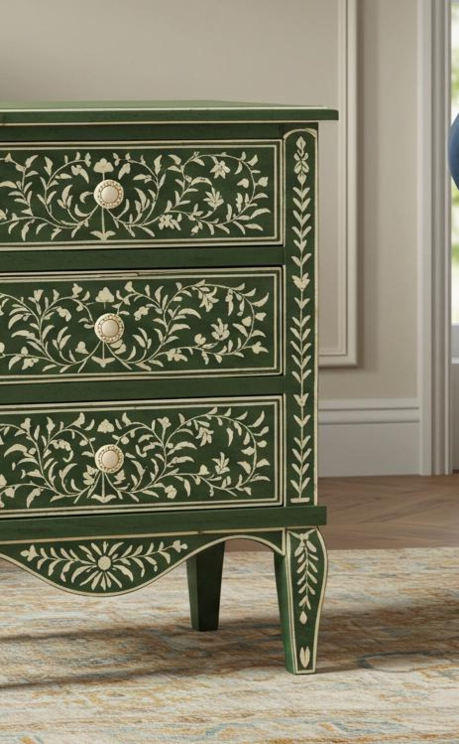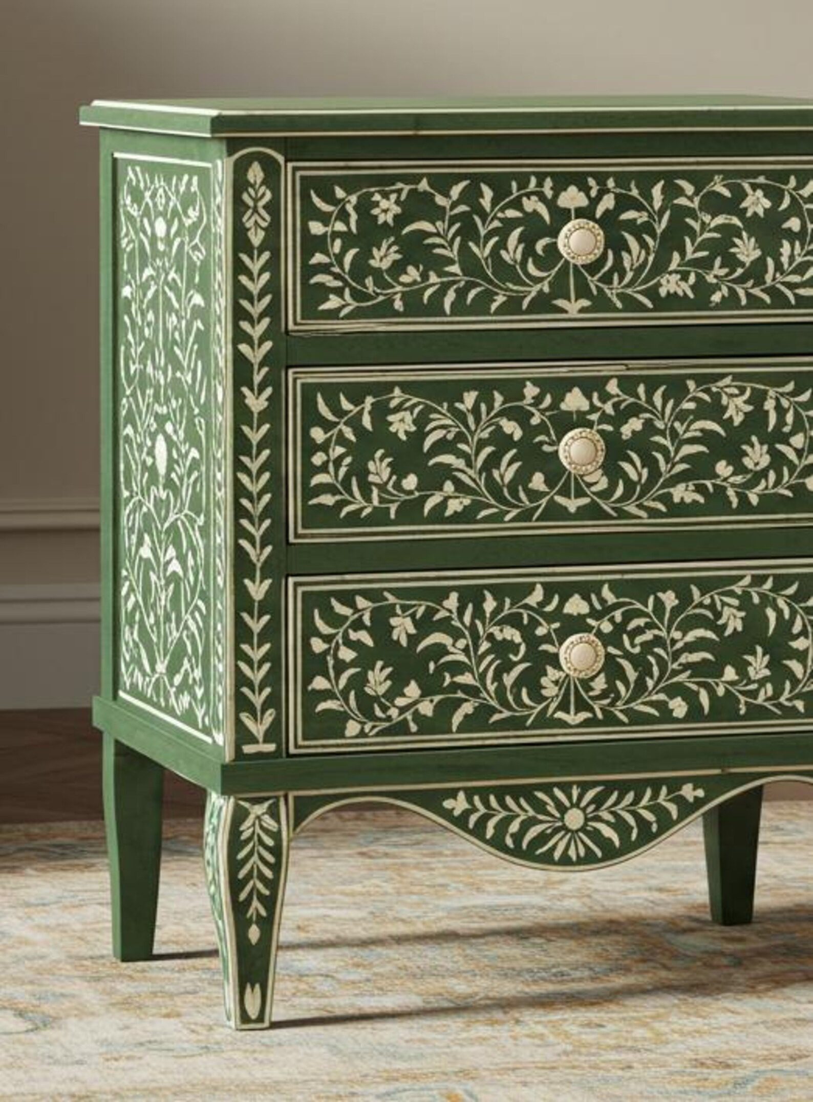 Green Bone Inlay Floral Bedside Table – Handcrafted Square Nightstand