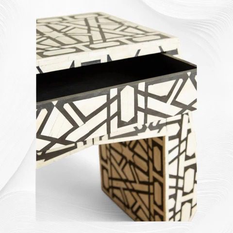 The Marrakesh Bone Inlay Bedside Table is a handcrafted masterpiece that combines timeless artistry with modern functionality. Featuring a bold black finish and intricate floral motifs, this luxury nightstand is designed to elevate any bedroom interior. Each piece is carefully made by skilled artisans using ethically sourced bone inlay, ensuring a unique and elegant addition to your home.