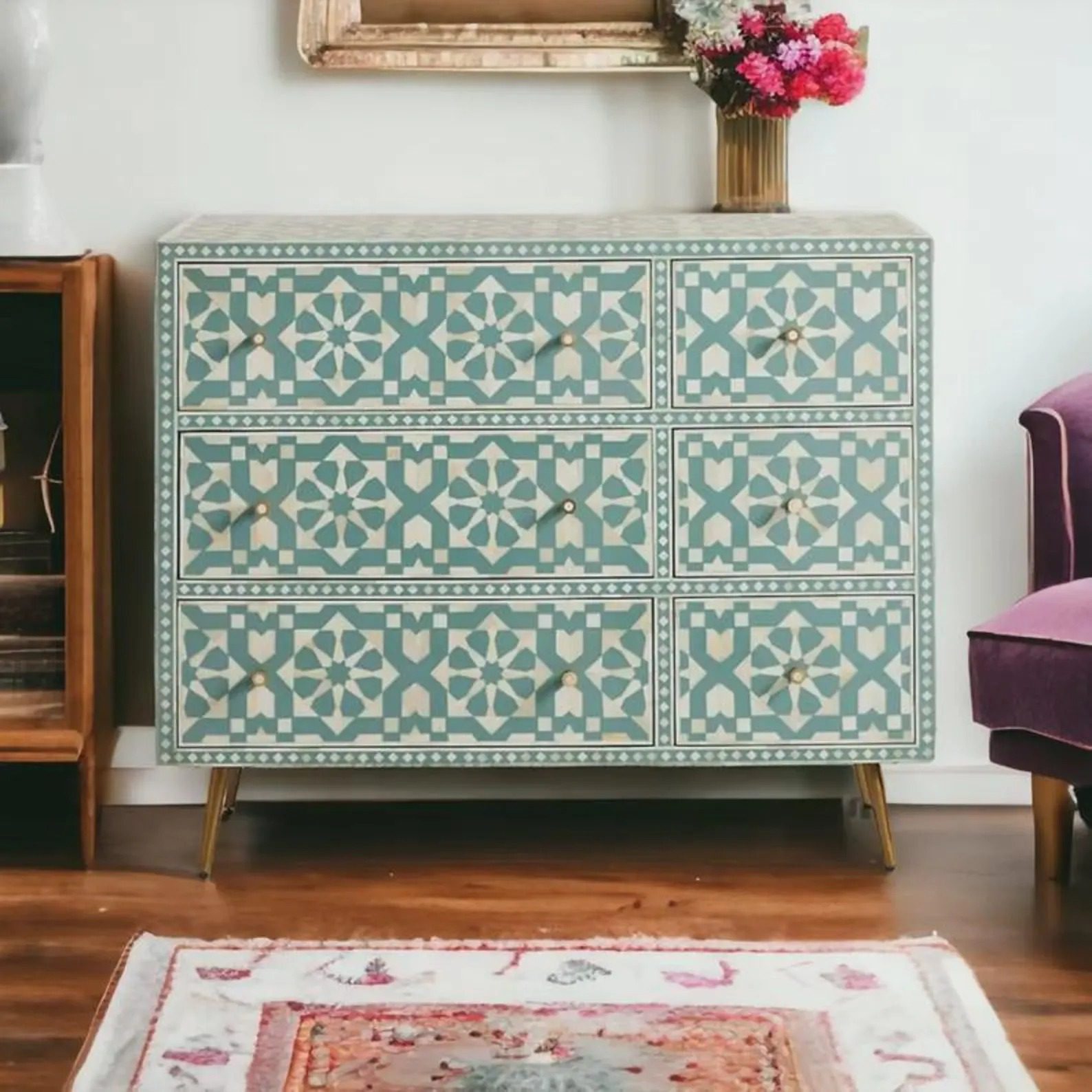Bone Inlay Dresser – Moroccan Green Geometric 6-Drawer Dresser