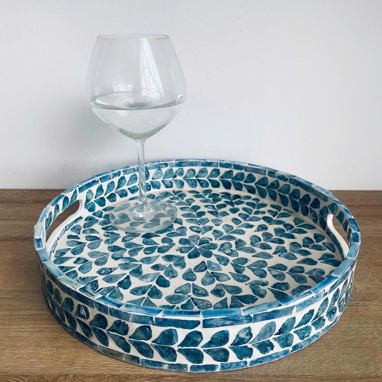 Each tray is a labor of love, carefully assembled from ethically sourced materials. Delicate fragments of iridescent Mother of Pearl are inlaid into a sustainable wooden base, creating a graceful blue leaf motif that evokes sophistication and tranquility. The high-gloss finish enhances its natural shimmer, making it a captivating centerpiece for any coffee table, console, or dining setting.
