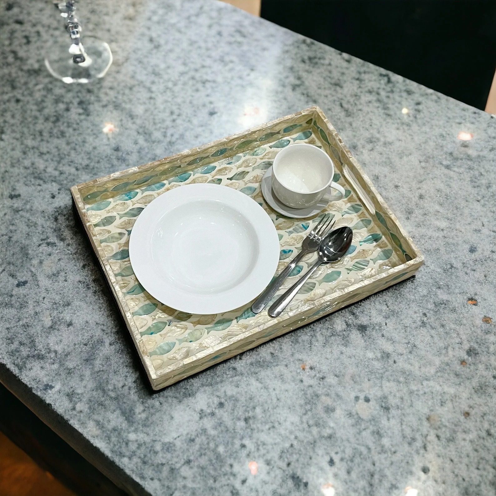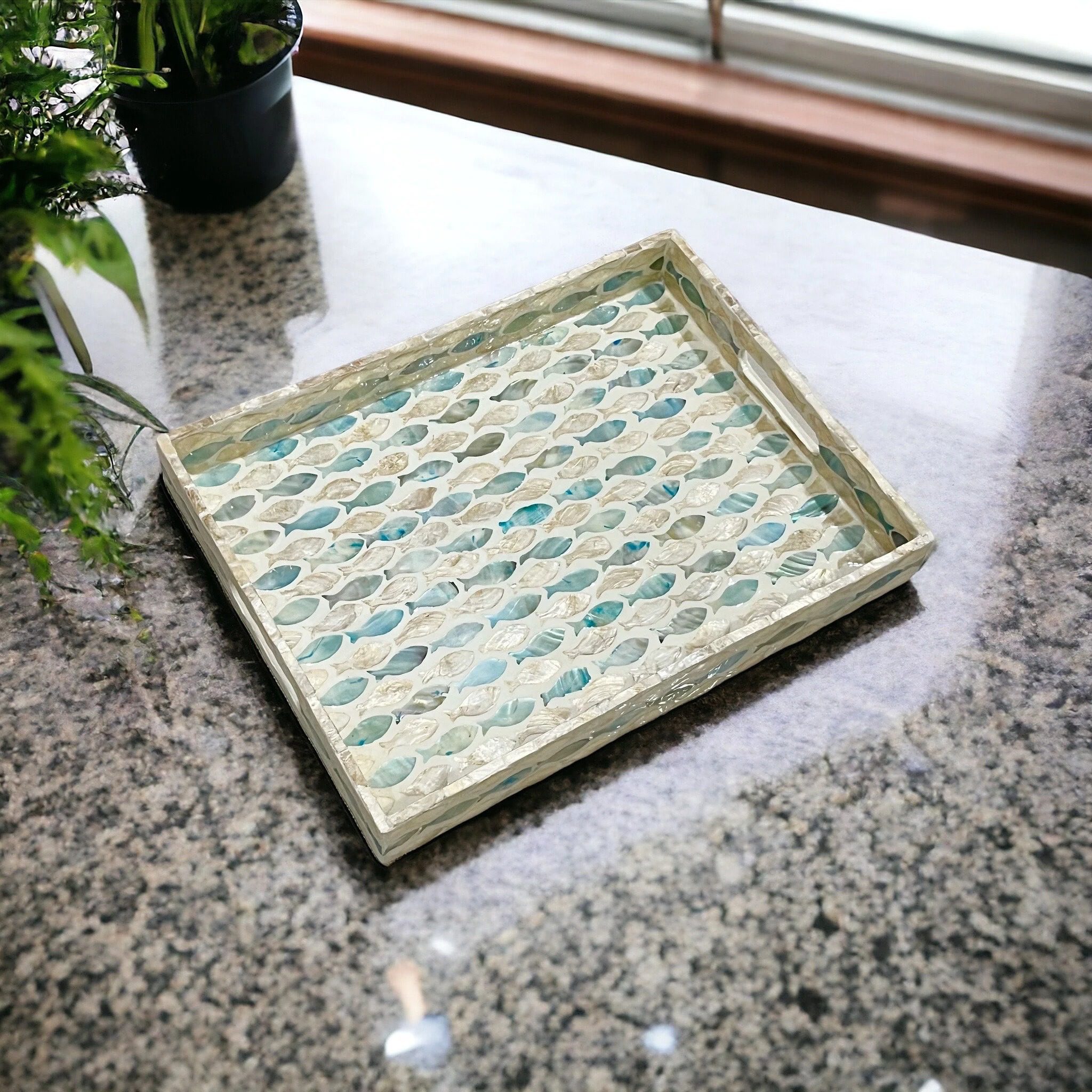 Perfect for serving drinks, snacks, or as a decorative centerpiece, this tray brings luxury to everyday living. The smooth finish, sturdy base, and shimmering mother of pearl accents make it ideal for both special occasions and daily use.
