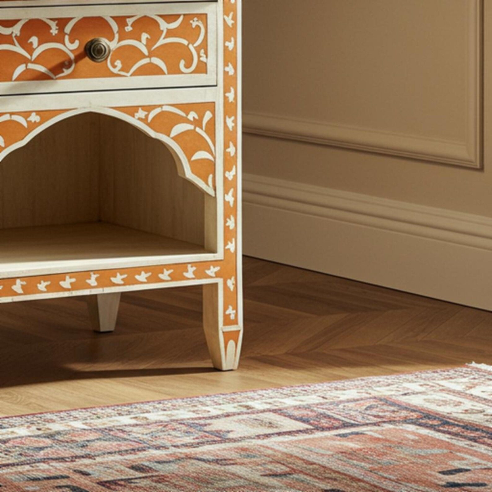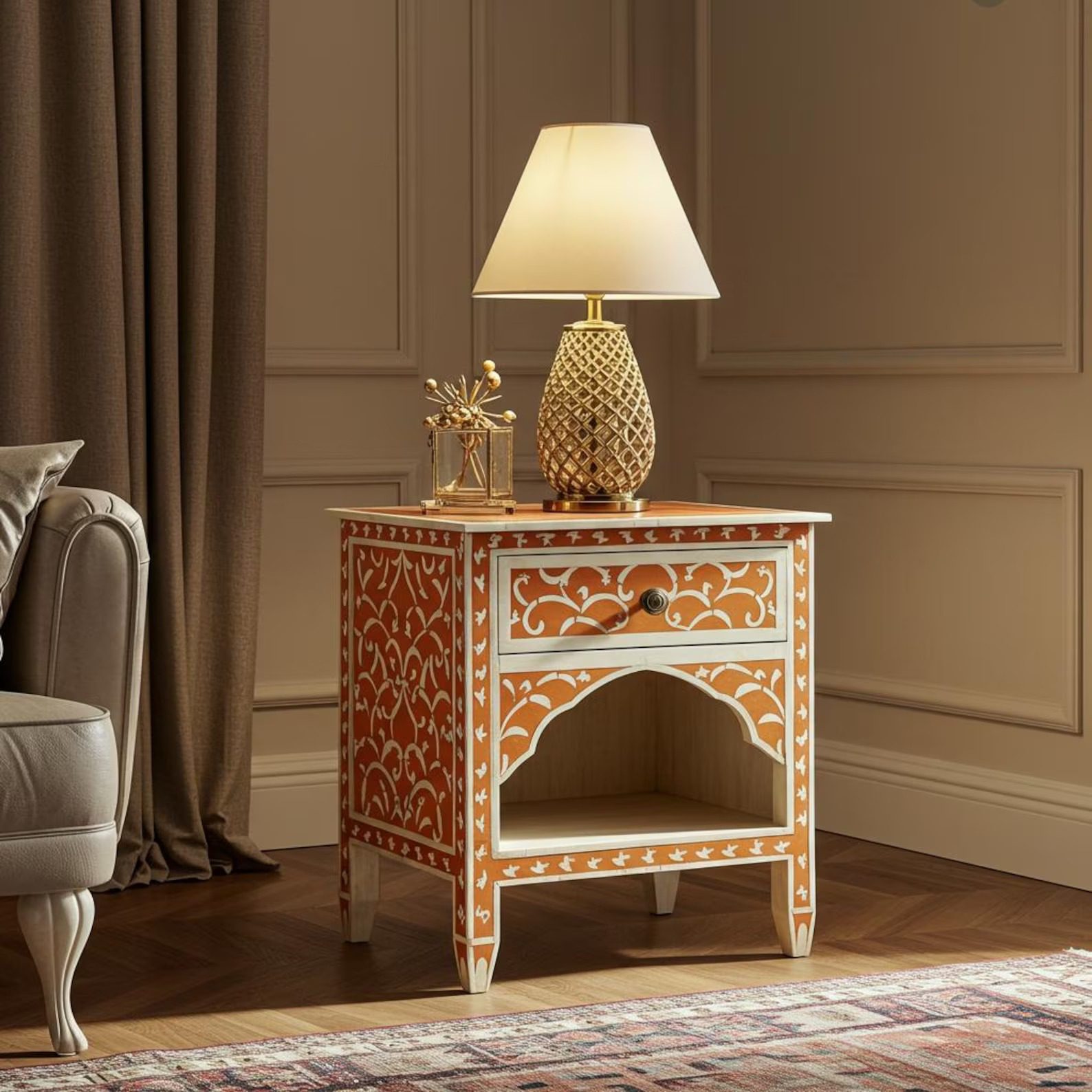 Handcrafted Orange Bone Inlay Nightstand – Chevron Inlay 1-Drawer Luxury Bedside Table