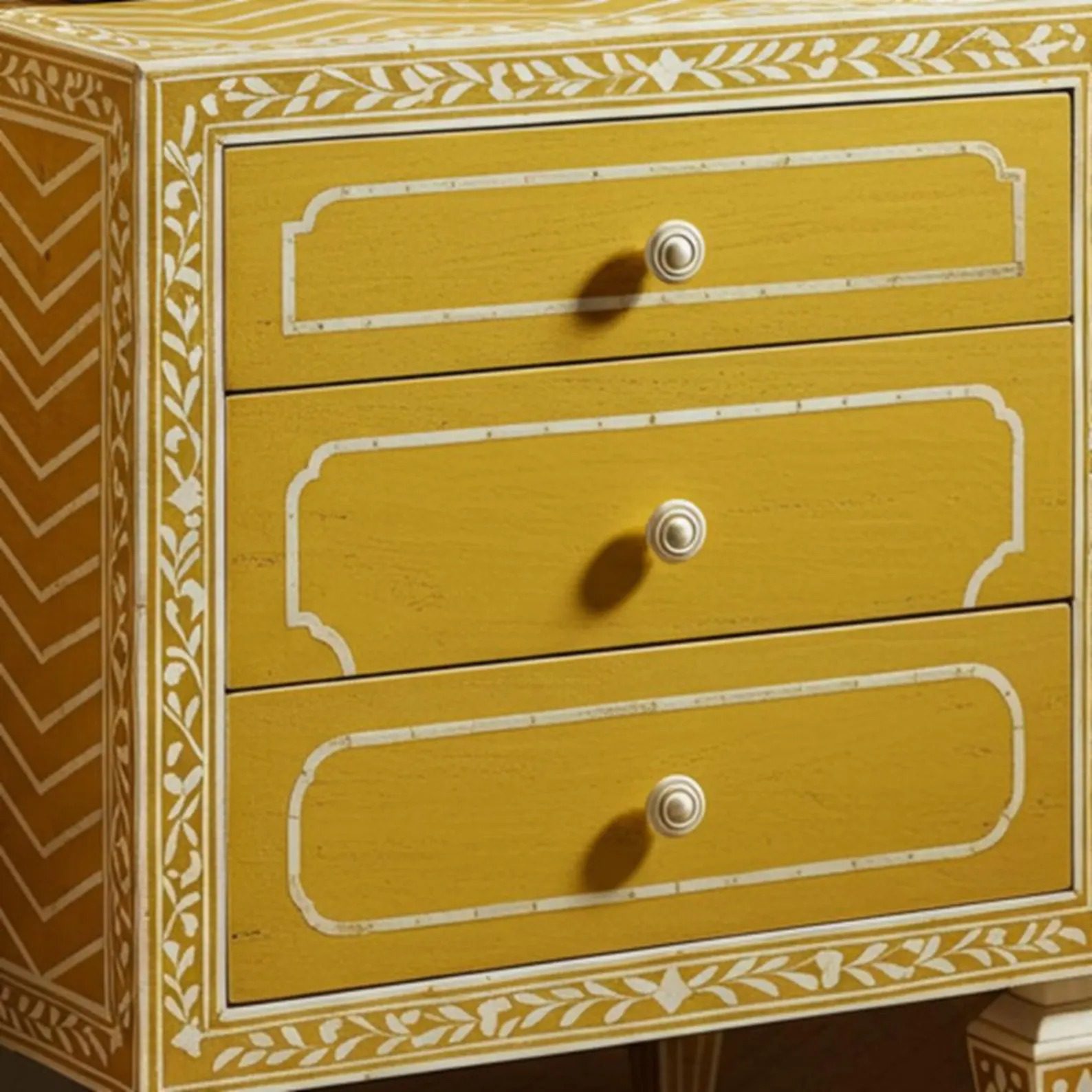 Brighten your space with this stunning yellow chevron bone inlay nightstand, a true masterpiece of heritage artistry and modern elegance. Handcrafted by skilled artisans, it blends vibrant design with functional storage, making it a versatile and stylish addition to your interiors.